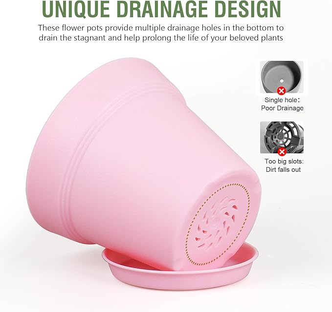 - 【Drainage Holes and Trays】Each plant pot features well-designed drainage holes at the bottom to ensure proper water flow. Additionally, saucers catch excess water, keeping your growing area clean and tidy while also ensuring that your plants remain hydrated without becoming waterlogged.