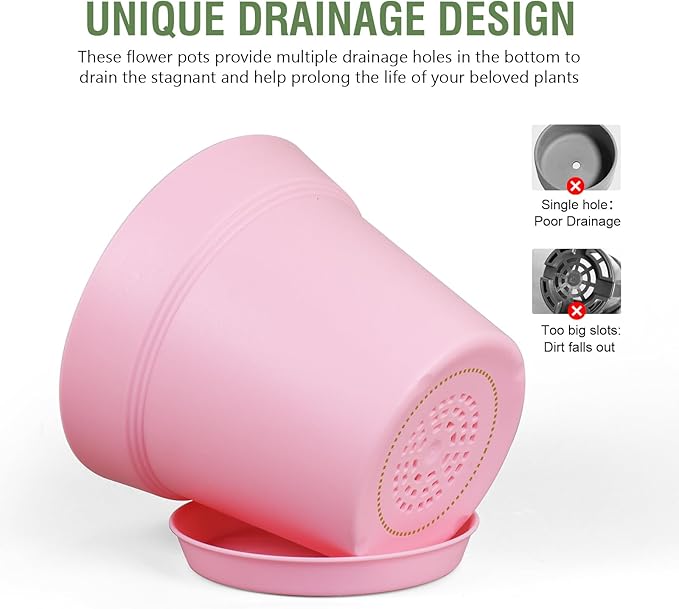 - 【Drainage Holes and Trays】Each plant pot features well-designed drainage holes at the bottom to ensure proper water flow. Additionally, saucers catch excess water, keeping your growing area clean and tidy while also ensuring that your plants remain hydrated without becoming waterlogged.