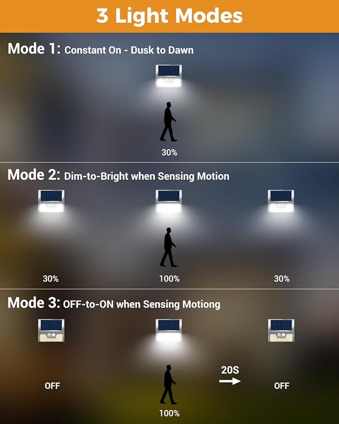 - Smart PIR Motion Inductor: vighep nickel brushed solar lights outdoor offer 3 lighting modes for versatile functionality. 1. Motion Sensor Mode: Lights turn on when people approach, ensuring safety and convenience. 2. Permanent On Mode: Lights stay illuminated all night for continuous visibility. 3. Smart Brightness Control: Lights stay on all night and automatically brighten when motion is detected, optimizing energy efficiency and enhancing security.