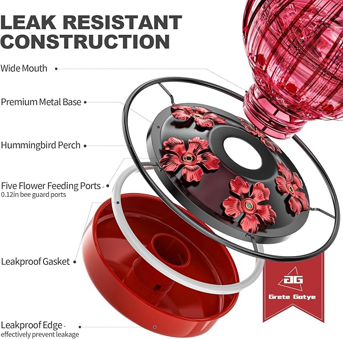 - LEAKPROOF FUNCTION - Build-in durable gasket, unique design makes base connection proper and seamless, even when the hummingbird feeders for outdoors hanging is shaken by wind or birds perching on it. After filling the container and screwing it onto the base, flip it over and hang it on a tree/deck hook/shepherd's hook/hangers/window hook.