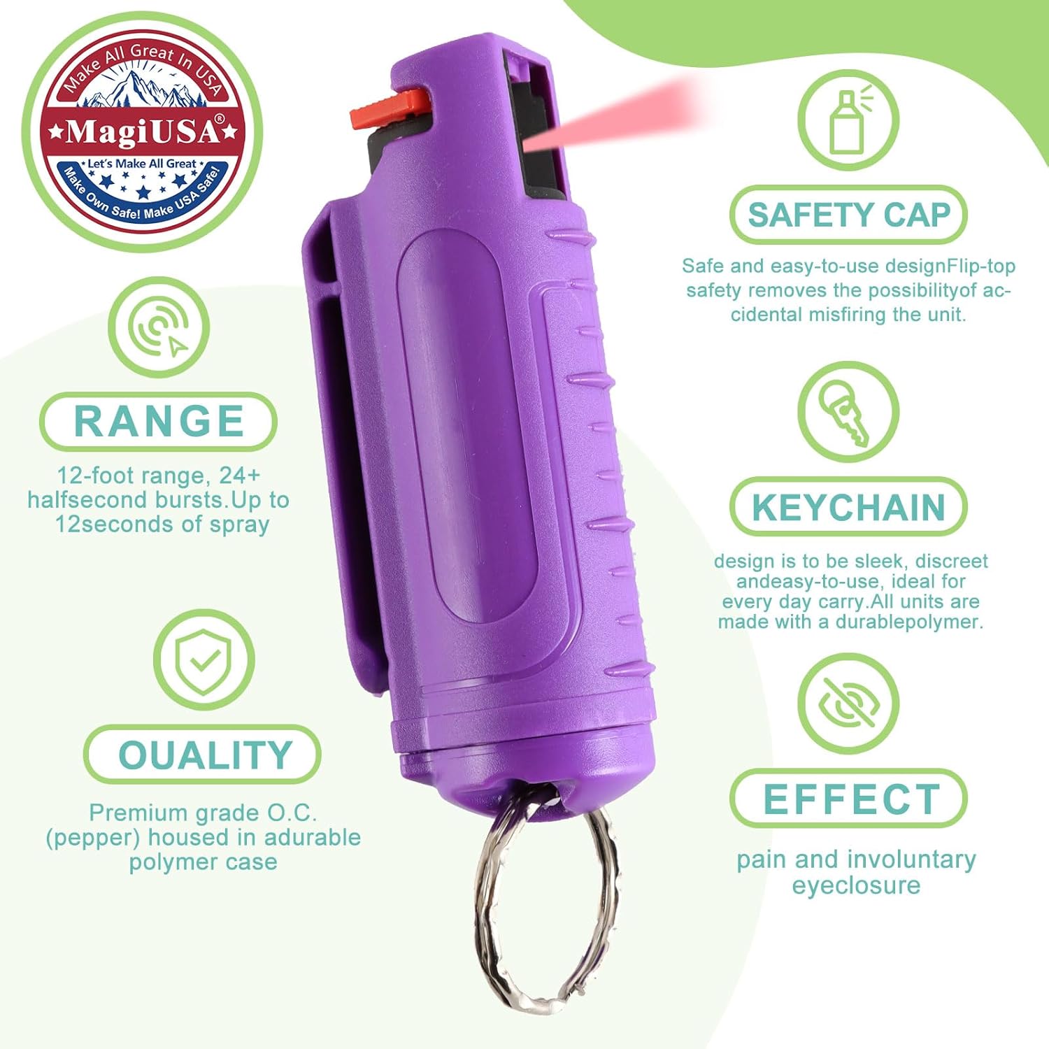 - 📦 MagiUSA – make own safe, make USA safe! Our trusted 3-pack purple set empowers confidence and readiness wherever you go. Designed in the USA for smart, non-lethal everyday protection with impact.
