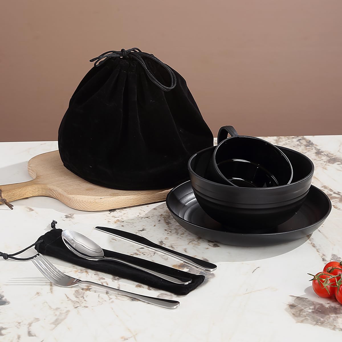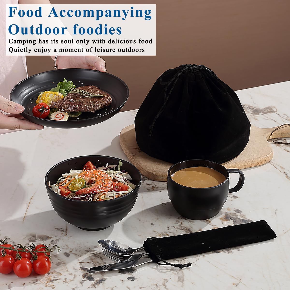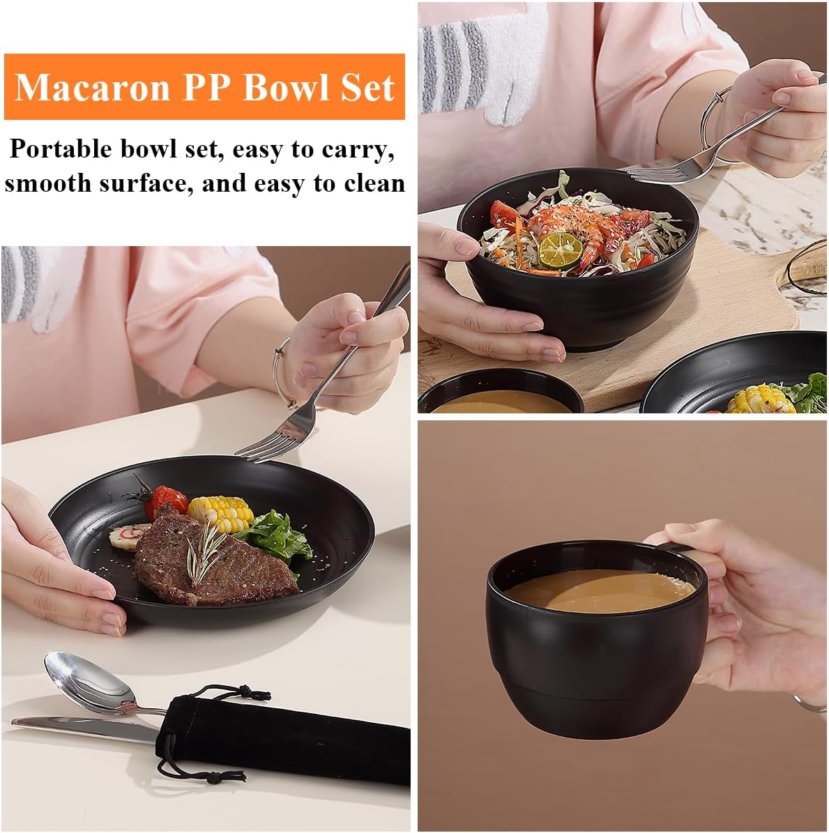 - Camping utensils set includes: 1 dinner knife, 1 dinner fork, 1 dinner spoon, 1 plastics cups, 1 plastics plates and 1 plastics bowls.