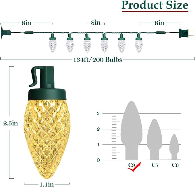 - đăShatterproof C9 Strawberry LED Bulbsă Each strand of string lights is 134 feet long and equipped with 200 bright C9 strawberry-shaped LED bulbs. They are easy to use - just plug and unplug for ON and OFF - and long enough to wrap around a Christmas tree or anywhere else you'd like to add some light, such as your porch, garden, lawn, yard, or roof.
