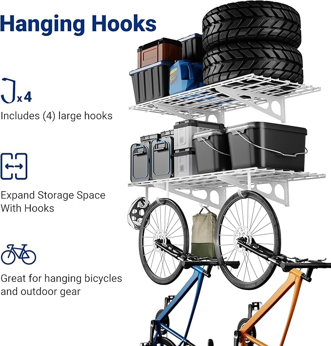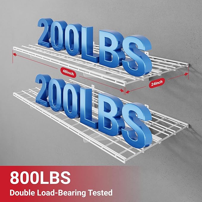 - High Load Capacity: The shelving can safely hold a total load of 400 lbs (200 lbs per tier). Each hook can safely hold 50 lbs.