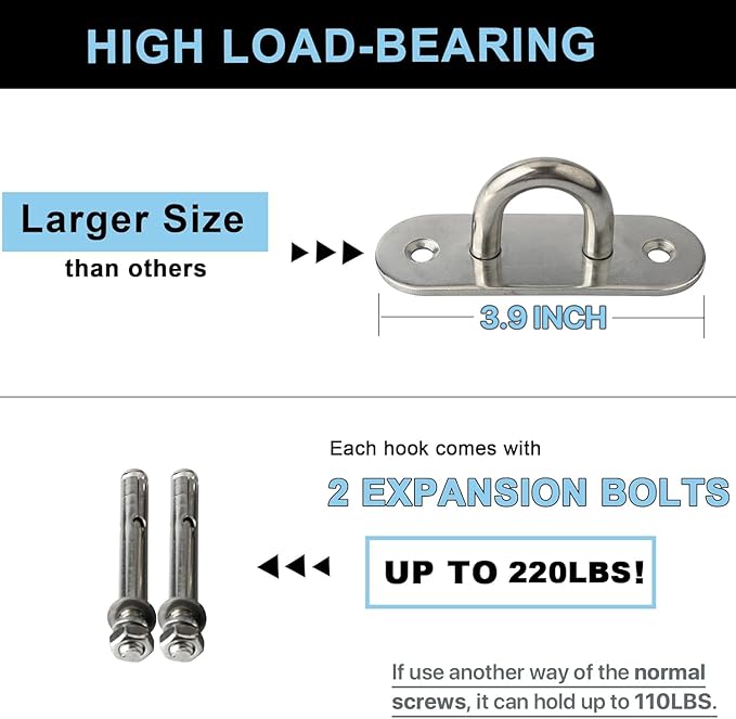 - Various applications: Our eye hooks are very suitable for hammock chairs, porch swings, swing chairs, sandbags. This high-quality hammock hook and carabiner is suitable for the ceiling of your garage or room, porch or balcony. In addition, it can be used to plug small yachts and anchors, roof beams, ceiling fans, and can also be used as luggage and home accessories.