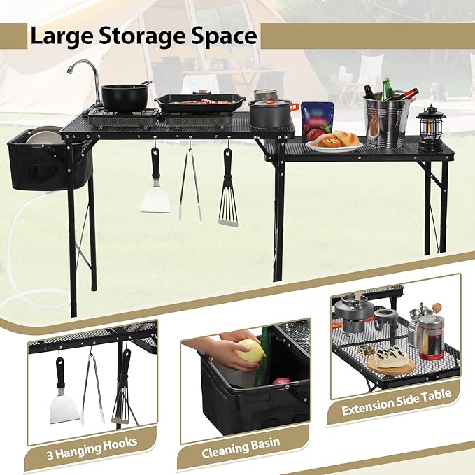 - Foldable & Easy to Carry: With no extra tools required, you can fold or unfold in minutes to set up your perfect camping cooking table anywhere, anytime. Net weight: 11lbs/5kg. It also has a handle for easy carrying.
