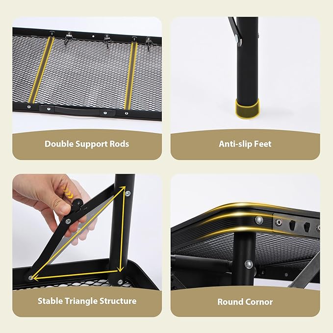 - Stable & Sturdy: The high quality table is made with aluminum alloy frame, and the desktop is made of high-density metal mesh. It can bear up to 66lbs/30kg. The table legs are designed with X-shaped structure and have anti-slip foot, which improves the stability.