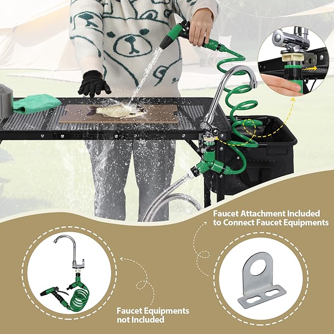 - Warm Attention: The package of this kind of grill table includes: 1*grill table with a sink, 1*launching valve, 1*strainer, 1*faucet attachment, 1*drain pipe. But faucet equipments are not included.