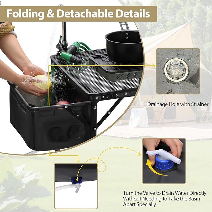 - Details: There are several hooks on the edge of the multifunctional table. You can use it to hang all kinds of kitchen utensils to help you cook better. There is also a detachable water basket on the side of the table. You can use it to clean fruits, vegetables and dishes, and can also be used as a storage bag.