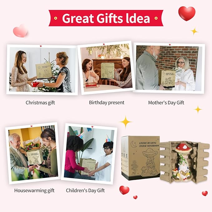 - Unique Design:The gnome is sitting under a big red mushroom, sipping coffee while slowly flipping through a book, vividly depicting the gnome's leisure life in detail. Make this garden decoration cute and charming. It is a beautiful solar powered garden gnome statue, measuring 10.23X9.55X7.48 inches.