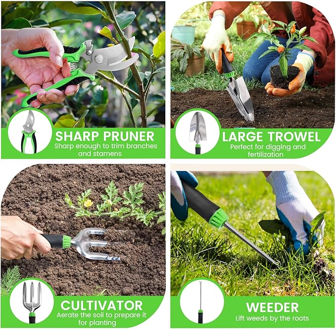 - 【Two Removable tool bag & 4 Heavy Duty Garden Tools】 The gardening tool sets includes a large trowel, cultivator, weeder, pruning shears and an Oxford cloth Tool hand bag+tool pouch to keep all your tools packed away provides everything you need to maintain a beautiful and healthy garden.