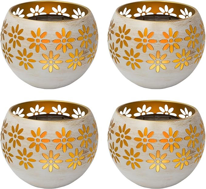 5.4” 4-Pack Decorative Metal Solar Patio Light with Flickering Flame, Waterproof Dusk-to-Dawn Garden Lantern, White