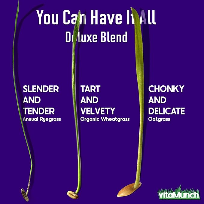 - This Deluxe Blend contains seeds for three favorite cat grasses: Wheatgrass, Oat Grass, & Annual Ryegrass seeds. Wheatgrass has a sassy taste, strong and fuzzy texture, and is very cute! Oat grass has thick and tender satisfying blades and mild taste. It's chonky seeds mean it grows more sparsely, and that's okay because slender and tender ryegrass fills in with its delicious and tenacious graceful blades.