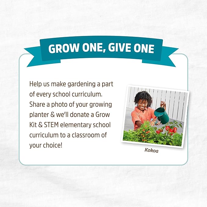 - GROWONEGIVEONE — Help us make gardening a part of every school curriculum. Share a photo of your growing planter & we’ll donate a Grow Kit & STEM elementary school curriculum to a classroom of your choice