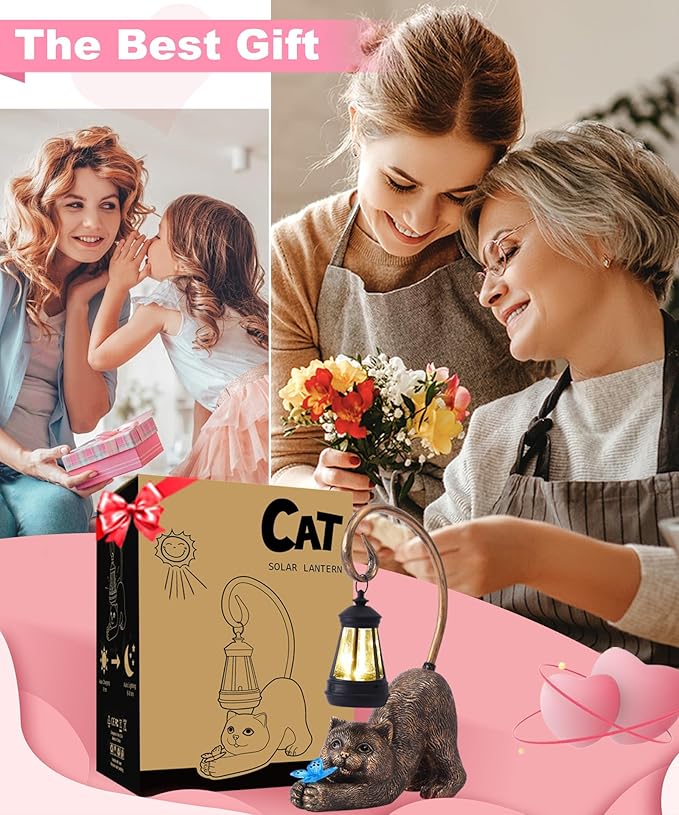 Solar Cat Garden Statue for Outdoor: Outside Sculptures Decor for Art Patio Balcony Yard Lawn – Unique Birthday Gift for Women Mom Grandma