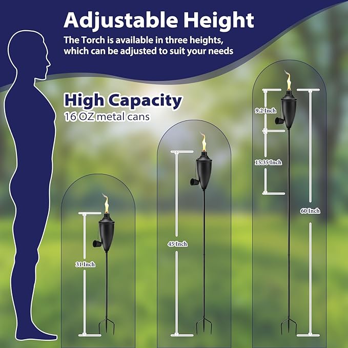 - 【Large Capacity】 Each torches hold approximately 22 oz of fuel, recommended using a funnel when filling torches with oil. Please use snuffer to put out flame and protect the wick after use.