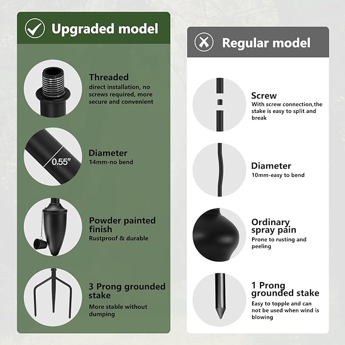 - 【3-Prong Stake】Improved the grounded stakes to 3-prong stake, which is more stable. No bends and breaks.