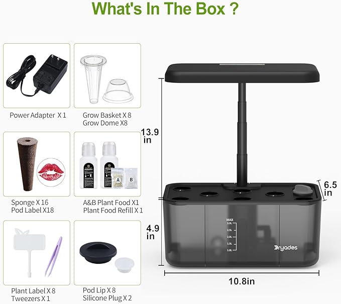 - 【What You Can Get 】Planting Machine x1(seeds not included),Power Adapter x1,Grow Basket x8, Sponge x16 ,A&B Plant Food x1,Plant Food Refill x1, Plant Label x8 , Grow Dome x8 ,Pod Label x8 ,User Manual x1 ,Tweezers x1 ,Pod Lip x8 ,Silicone Plug x2.