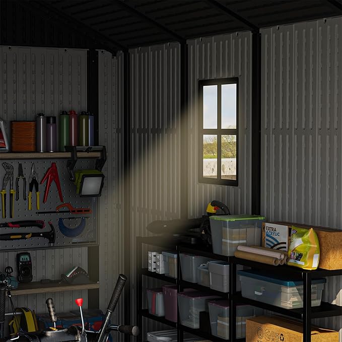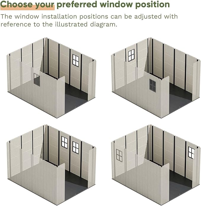 - Window design: Lets in natural light, reducing the need for extra lighting;Provides a pleasant view;Offers added security with a view of the shed's contents.And the position of the window can be adjusted according to your needs with the wall panel