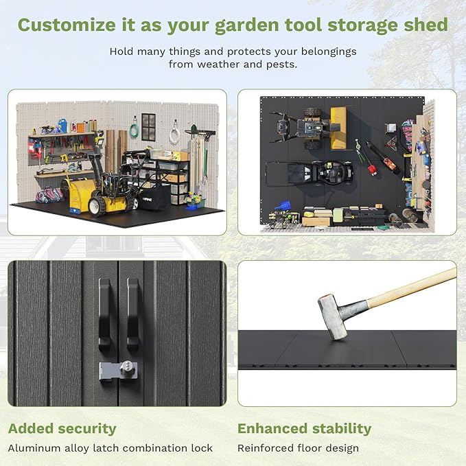 - Plastic Floor Base Provides High Stability: The plastic floor base is sturdy and reliable, providing a safe place to store all of your outdoor tools and equipment. It adds an extra layer of protection against water damage and moisture, ensuring that your belongings remain safe and dry.