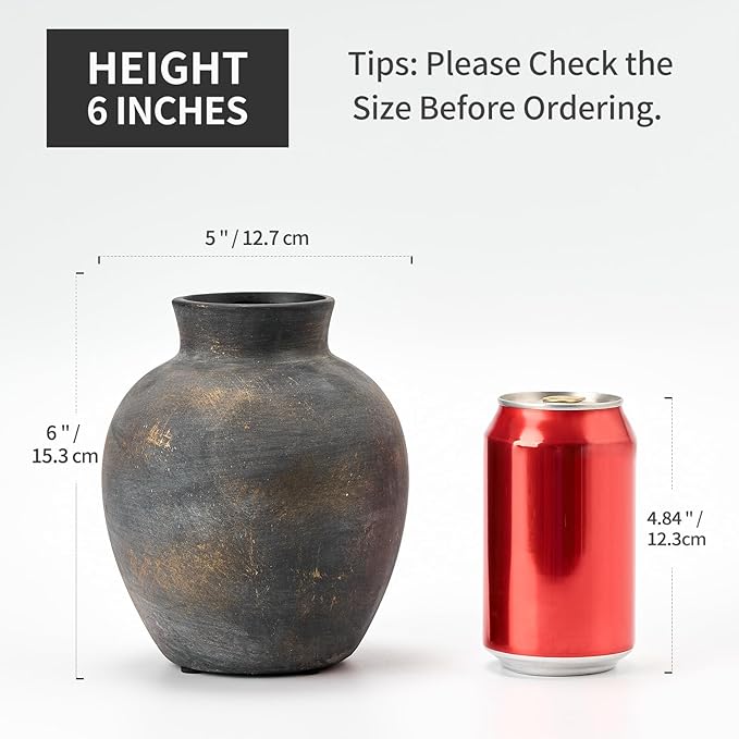 - ๐๐๐๐ฌ๐ฎ๐ซ๐๐ฆ๐๐ง๐ญ๐ฌ: The rustic vase measures 6" height and 5" width with 2.4" opening.Perfect for greenery and dry or faux florals,but also can hold water for fresh flowers.The vase itself can be displayed indoors or outdoor as a fine decorative piece.