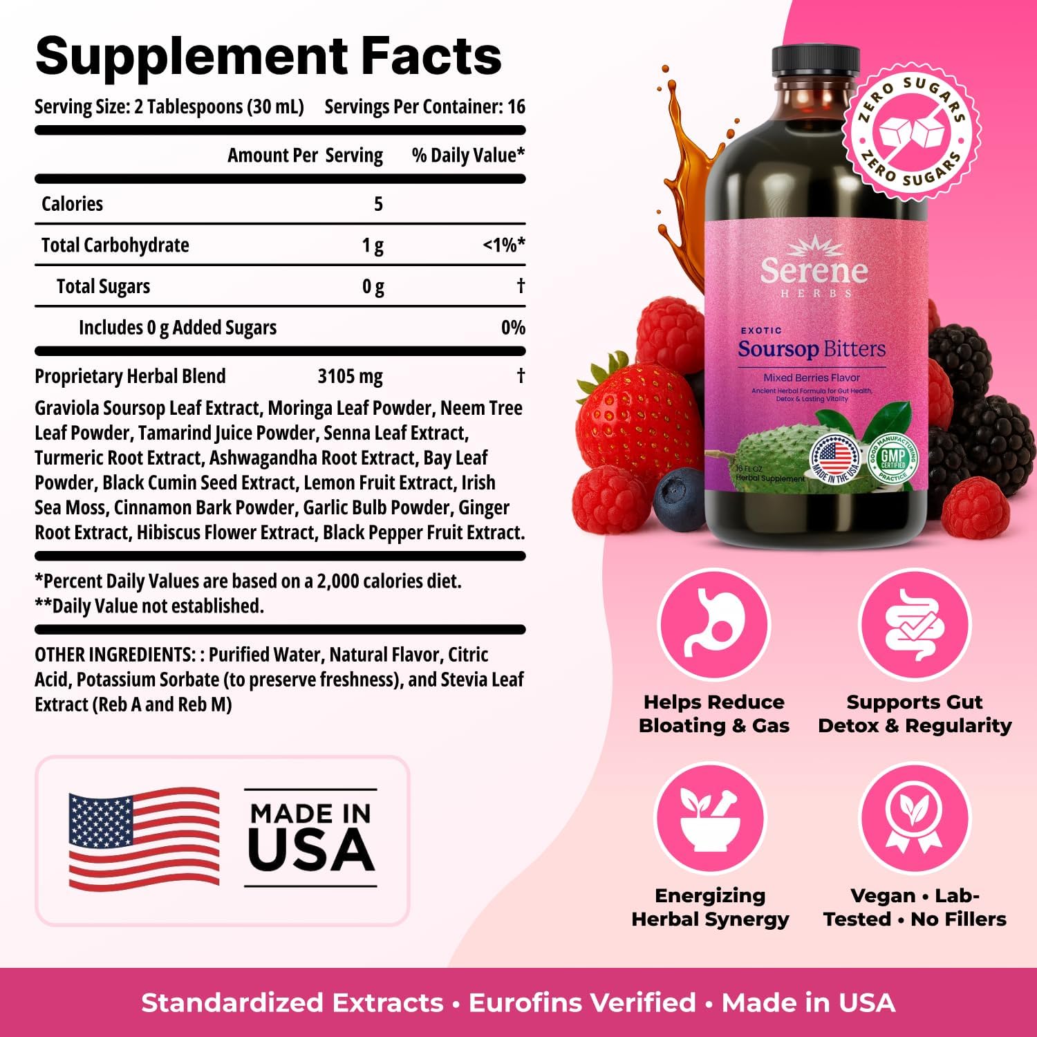 Serene Herbs Soursop Bitters Liquid - Organic Herbal Sour Sop Guanabana with Black Seed, Moringa, Irish Moss & Ginger – Gut Support, Energy & Immune Boost – Vegan, Non-GMO – Mixed Berry Flavor – 16 oz