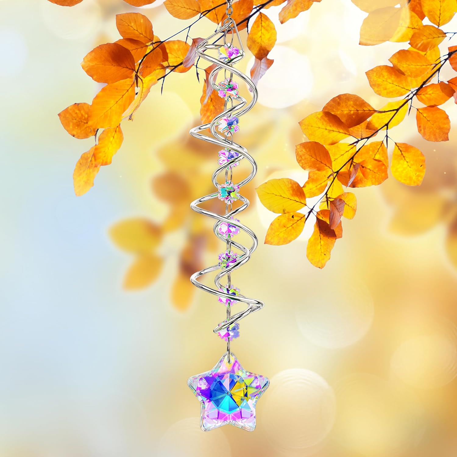 - Eye-catching Design: This wind spinner features a 1.18 inch ab coating star prism and 9 snowflake beads crystals that beautifully reflect sunlight and create stunning visual effects in your Christmas