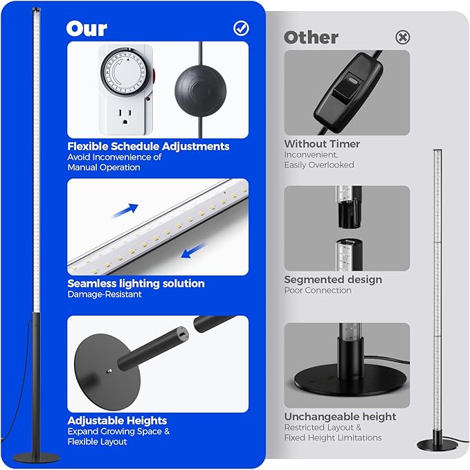 - Adjustable Height for Flexible Lighting : Experience the versatility of our upgraded vertical grow light. With an adjustable height range of 4ft-5.6ft, it caters to tall plants and large plant shelves, ensuring optimal illumination