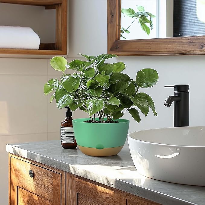 8 Inch Pots for Indoor Plants, Self Watering Planters with Drainage and Saucers, Plastic Outdoor Flower Pot, Set of 2, Green