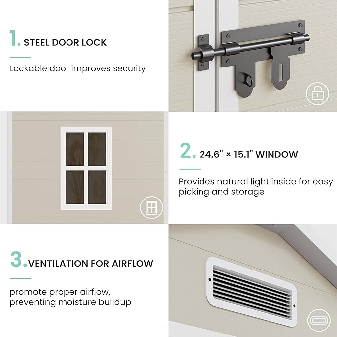 - STURDY FLOOR AND WINDOW: Equipped with a sturdy floor, our outdoor storage cabinet effectively prevents moisture from seeping into the structure, safeguarding your belongings from potential damage caused by dampness, mold, or rot. The window design facilitates ventilation and natural light. It allows the visibility of tools from the outside and enhances the aesthetics of the shed