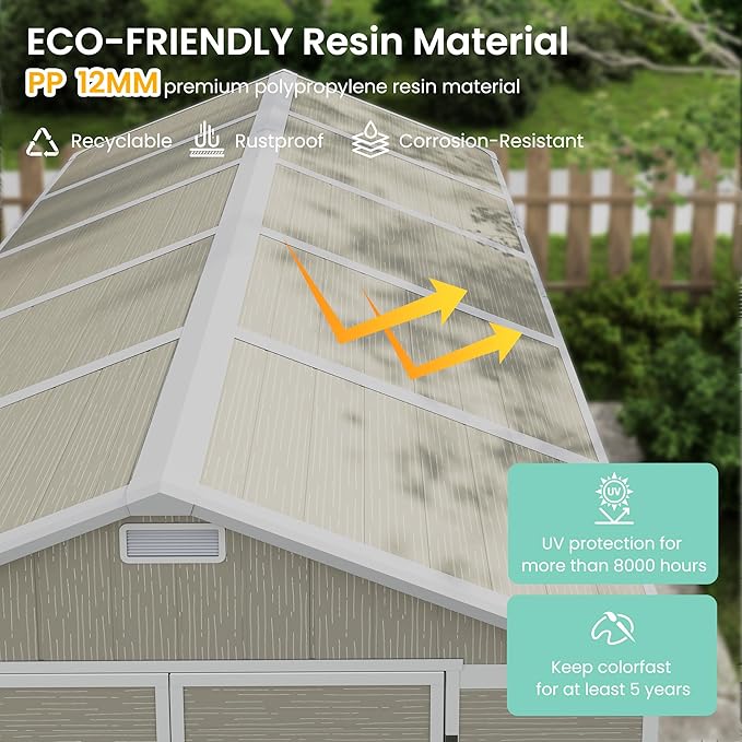 - RECYCLABLE RESIN MATERIAL: Our storage shed is crafted with 12 MM premium polypropylene resin plastic, which is recyclable. Resin shed is corrosion-resistant, waterproof, rustproof and with UV protection for more than 8000 hours, less bending and puncturing, worry-free for use in all weather conditions. It can be used daily for five years without fading