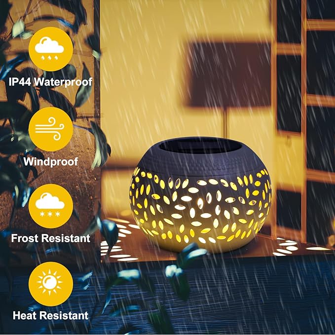 - WEATHER RESISTANCE: Solar lamp are made of high quality metal. The IP44waterproof system and anti-rust coating can resists high temperatures and rain and snowThis lamp was built to withstand all kinds of weather all round year.
