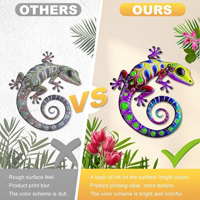 - Durable Metal Material: Metal gecko made of iron, after rust treatment, high-definition pattern printing. One layer of ink on the surface, bright colors. Durable, not afraid of the sun and rain, uneasy to fade, suitable for outdoor wall decoration