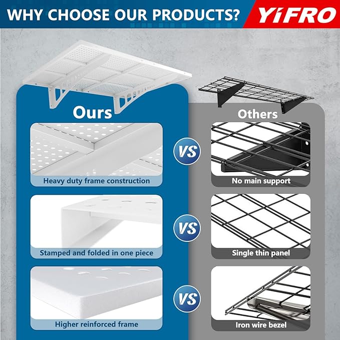 - HEAVY DUTY CONSTRUCTION: YIFRO garage wall shelving takes its cues from architectural frame construction, with a 1.5x4 ft individual bracket load capacity of 250 lbs. and a total of 1000 lbs. for 4 shelves, which makes it easy to store most of the items in your garage.