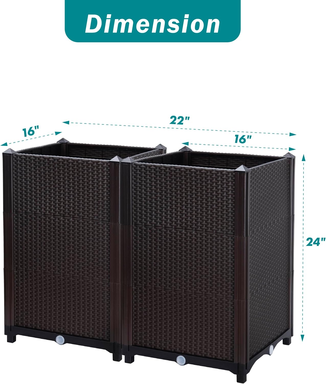 - Size: 16”(L) x 16”(W) x 30"(H) inches; Inner dimension for each planting box: 14”(L) x 14”(W) x 28"(H) inches.