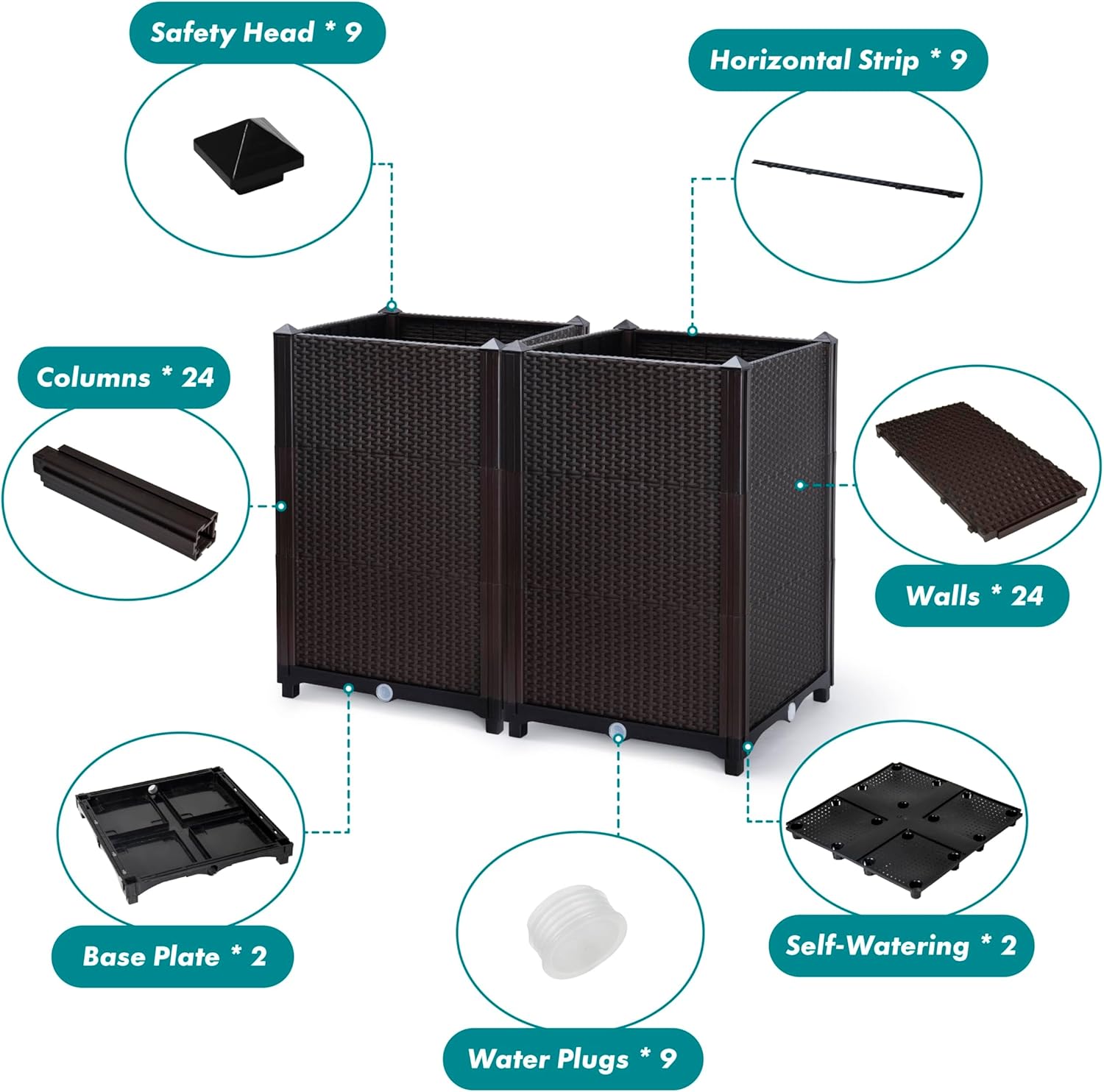 - Watering System with Reservoir: Built-in water reservoir design for excessive water drainage to avoid plant roots decay and keeping soil with moderate moisture and heathy root grow condition. Drainage caps are included on four sides of the planter boxes for most convenient drainage option.