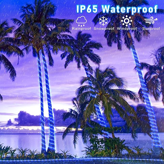 - 【Waterproof Outdoor String Lights】- IP65 Waterproof design, they are suitable for all weather use, remaining bright and sparkling even during strong rain and windy days. The outdoor rope lights is ideal for year-round outdoor decor and can illuminate gazebos, canopy, corridors, gardens, and patios. But please note the plug is not waterproof.