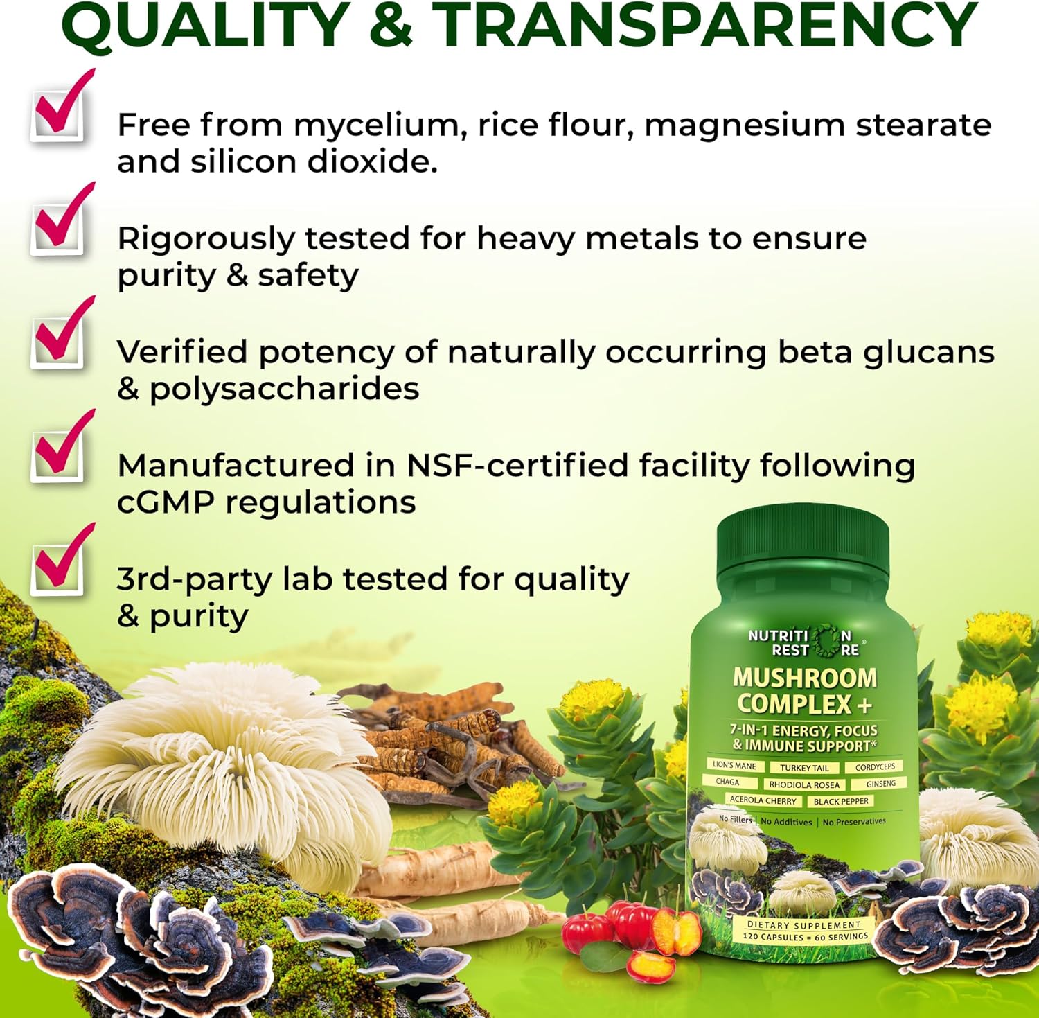 Organic Mushroom Complex: Lion's Mane, Turkey Tail, Cordyceps, Chaga, Contains Naturally Occurring Beta Glucans - Organic Energy & Immune Support Blend: Rhodiola Rosea, Ginseng & Acerola Cherry 120Ct