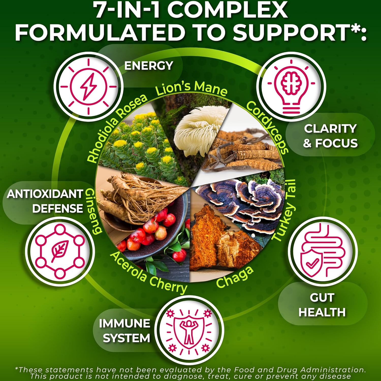 - Synergetic Energy & Immune Support Formula: Our Mushroom Complex features organic lion’s mane, organic turkey tail, organic cordyceps, organic chaga, and a potent proprietary blend of organic acerola cherry, organic rhodiola rosea, and organic ginseng. Together, this 7-in-1 complex supports energy, immune & cognitive function, gut health, clarity, and focus.