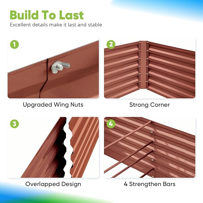 - 【Built To Last】Garden raised planting bed is made of powdered coating galvanized steel panel, assure fine condition of the metal garden bed, it's able to stand harsh weather conditions, won't crack in years, use without worry.