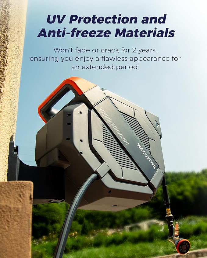 - Born for Irrigation: WACOTOYA engineers designed a gentle water pressure system for the auto rewind water hose reel to protect plants and ensure efficient irrigation with high flow rates