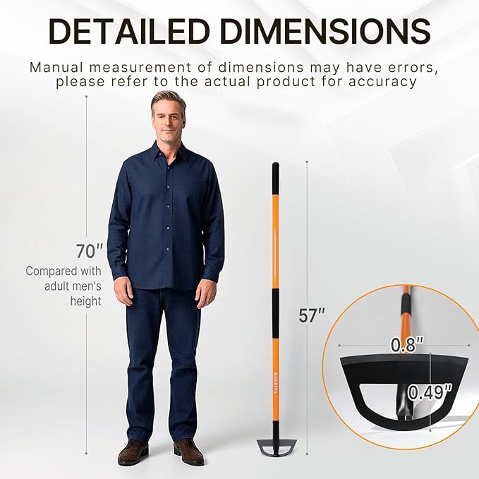- Full-Size Tool :The overall length is 57 inches,which can reduce the angle of bending and effectively relieve back pressure.The ultra light weight can also reduce hand pressure,and the handle anti slip cover ensures long-term use without hurting hands,making weeding easier.