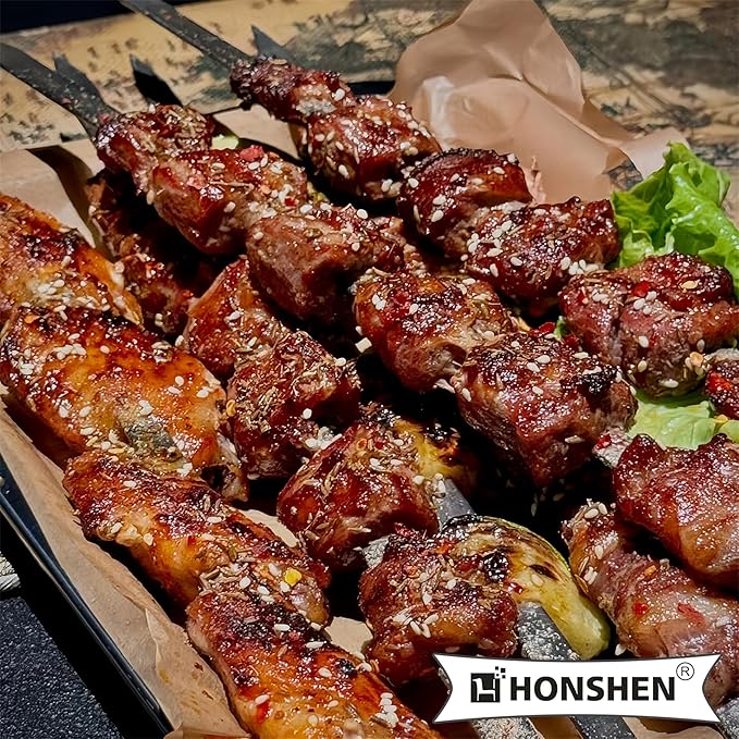 - 22 Inches long shish kabob skewers, Rust resistant stainless steel blade,Comfortable wooden handle grip;