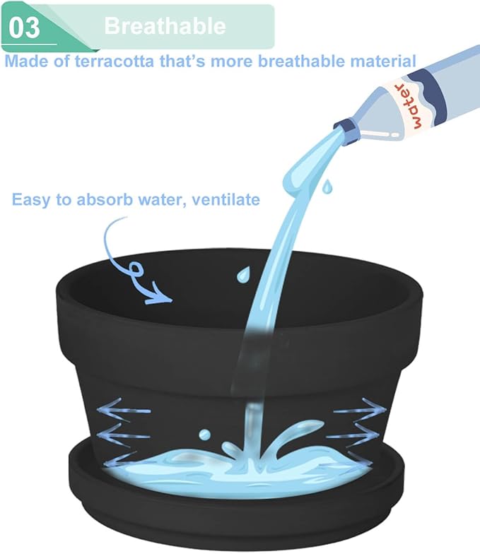 - Quality Materials: Terra cotta pots Making from high-quality clay through high-temperature baking, the walls of the pots draw the water out of the soil to help the soil dry quicker.
