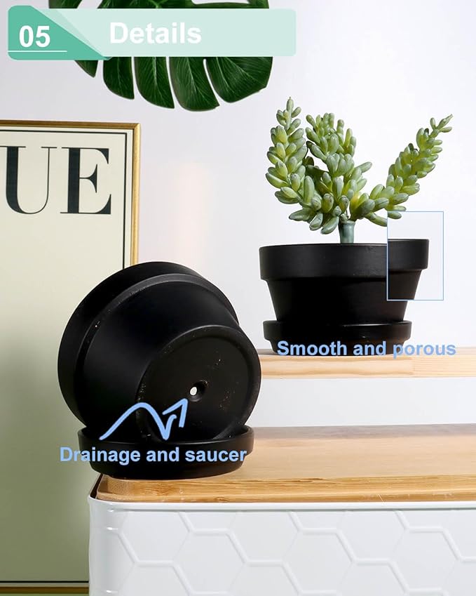 - Saucer&Drainage: Package included 6pcs terra cotta saucer to prevent dust and water from falling out of the drain, to keep the interior clean and to increase the beauty of the room the drainage outlet can prevent water accumulation and extend the life of the plant.