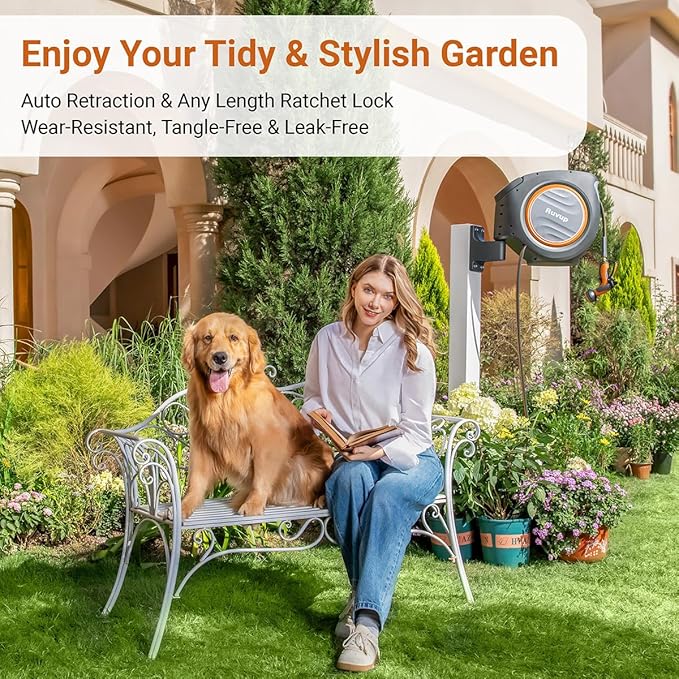 - Convenient, Tidy and Stylish: Featuring a patented ratchet locking system and unique automatic hose retractable technology, the Ruvup garden hose winding reel smoothly retract the hose back into the casing, no jamming or overlaps. Make your gardening tasks easier with the Ruvup wall mount hose reel and enjoy your tidy and stylish yard.