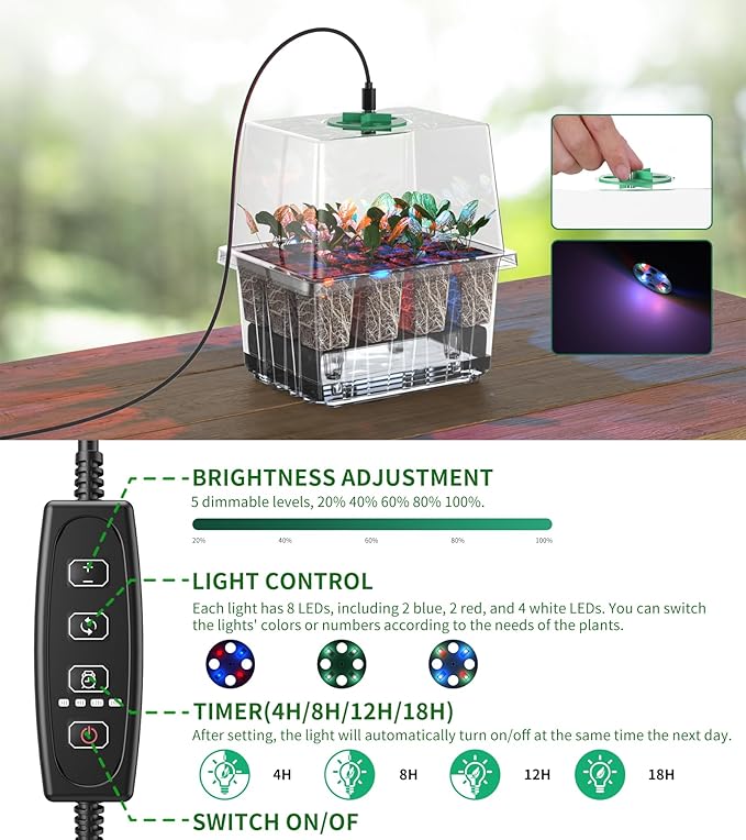 - 【Built-In LED Grow Lights for Optimal Growth】The integrated LED grow lights of this seed starting trays mimic natural sunlight, promoting vigorous growth. With adjustable brightness and timer settings, you can tailor the lighting to suit the stage of your seedlings' growth. Grow fresh basil, juicy tomatoes, or stunning flowers right from the comfort of your home—rain or shine.