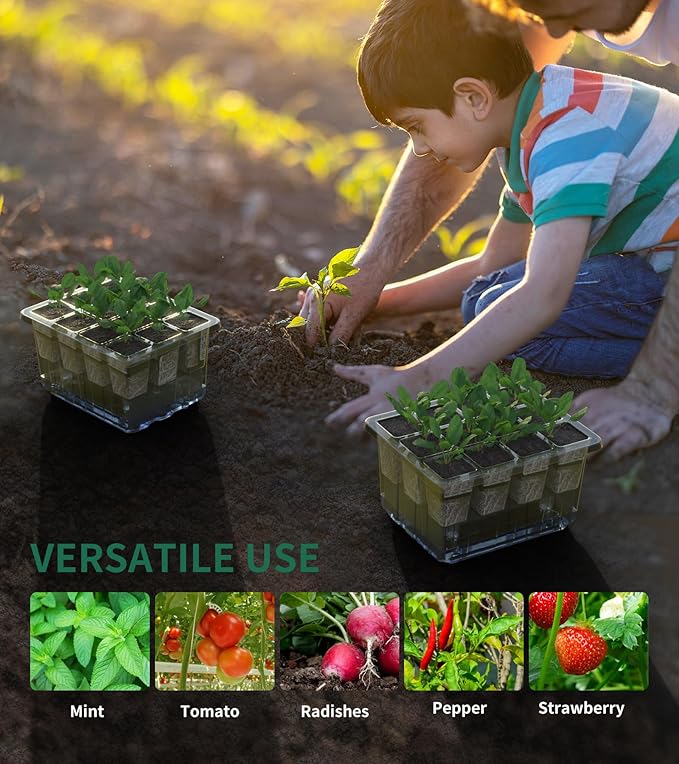 - 【Self-Watering System for Worry-Free Maintenance】Gardening just got easier with the innovative self-watering system of this seedling tray. The seed trays are equipped with capillary mats that absorb water and distribute it evenly to all cells, ensuring each seedling receives the right amount of hydration. Whether you're busy with work, or traveling, this gardening supplies provides peace of mind.