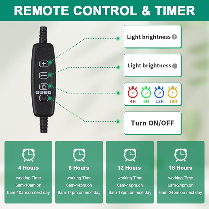 - LED Grow Light Included: Each tray contains an LED light for illuminating the seedlings to promote growth. Also the light has a controller with multiple settings that you can set the timer and brightness.It is a great helper for starting seeds indoors.