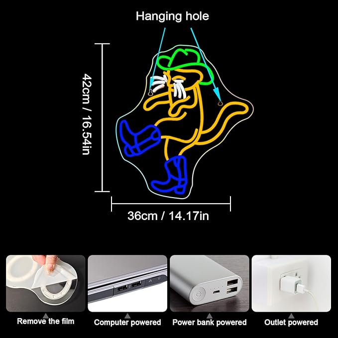 - Size:Cowboy cat neon sign: 36 x 42cm(14.2 x 16.5nch), USB Cable length: 1.8m (70.8 inch). The right size is eye-catching but does not take up too much space,that can be safely hung on the room wall or just place it on anywhere flat.
